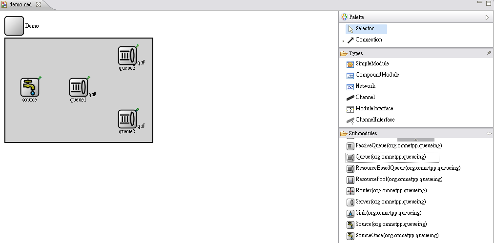 的排隊節點。在右側的Submodule裡面找到相對應的Queue和Source,拖到